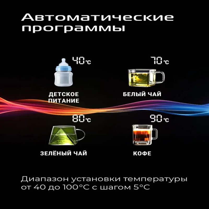 Благодаря автоматическим программам этот чайник идеально подойдет для ценителей разных горячих напитков. На панели управления можно выбрать один из 5 режимов: белый чай, зеленый чай, детское питание, кофе и кипячение. Заваривайте разные чаи и готовьте кофе при оптимальной температуре!