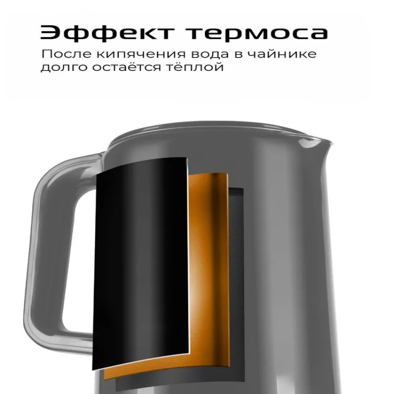 Благодаря двухслойной стенке вода в чайнике долго остается теплой — это удобно и позволяет экономить электроэнергию. Также двойная стенка гарантирует, что вы не обожжетесь: даже когда чайник кипит, корпус не нагревается.
